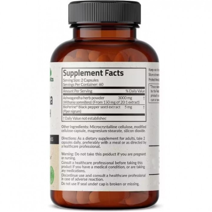 BioPerine (экстракт черного перца): 5 мг. Добавлен для значительного улучшения усвояемости (биодоступности) ашваганды организмом.