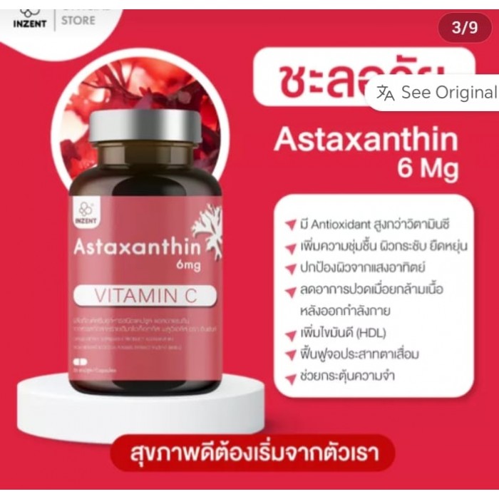 Это биологически активная добавка (БАД) на основе Астаксантина и Витамина С от бренда Inzent (Тайланд). Астаксантин — это мощный антиоксидант из группы каротиноидов, который получают из микроводорослей Haematococcus pluvialis.