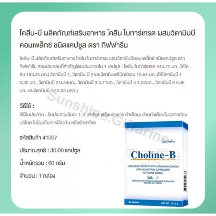 Это биологически активная добавка (БАД) под названием Choline-B от тайского бренда Giffarine. Она представляет собой комплекс холина и витаминов группы B, предназначенный для поддержки нервной системы и работы мозга.