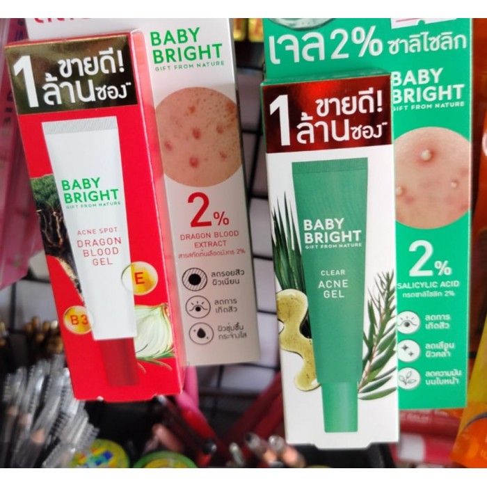 Два вида геля для ухода за кожей лица от тайского бренда Baby Bright, предназначенные для борьбы с акне и постакне (следами от прыщей).