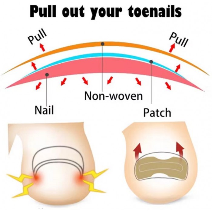 Пластыри работают за счет натяжения, которое приподнимает края ногтевой пластины, помогая ногтю расти в правильном направлении и снижая давление на окружающие мягкие ткани.