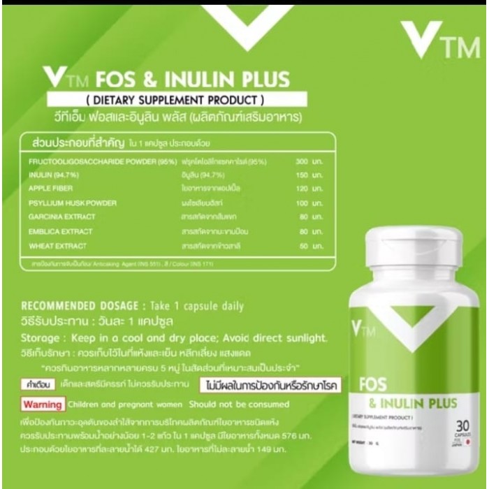 Это биологически активная добавка (БАД) тайского бренда VTM, которая называется FOS & INULIN PLUS. Судя по изображениям, это комплекс пребиотиков, направленный на улучшение работы кишечника и помощь в контроле веса.