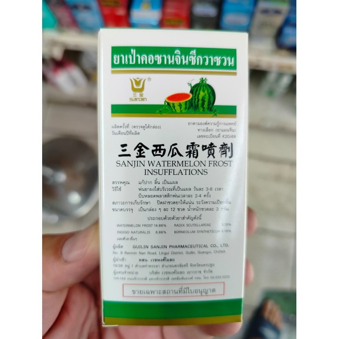 Это SANJIN Watermelon Frost Insufflations (ЯПАО КХО САНДЖИН СИКВАСУАН, 三金西瓜霜喷剂), китайский традиционный травяной препарат в виде порошка-спрея для наружного применения. Он известен своим охлаждающим, противовоспалительным и обезболивающим действием, особенно эффективен для лечения проблем в полости рта и горла.