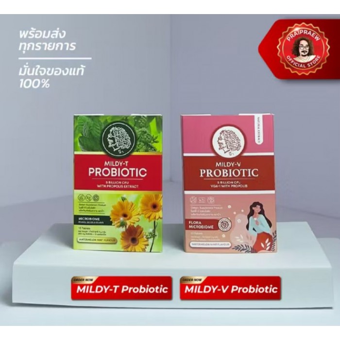 MILDY-T PROBIOTIC (зеленая упаковка) и MILDY-V PROBIOTIC (розовая упаковка) — пищевые добавки (пробиотики), разработанные для разных специфических целей.